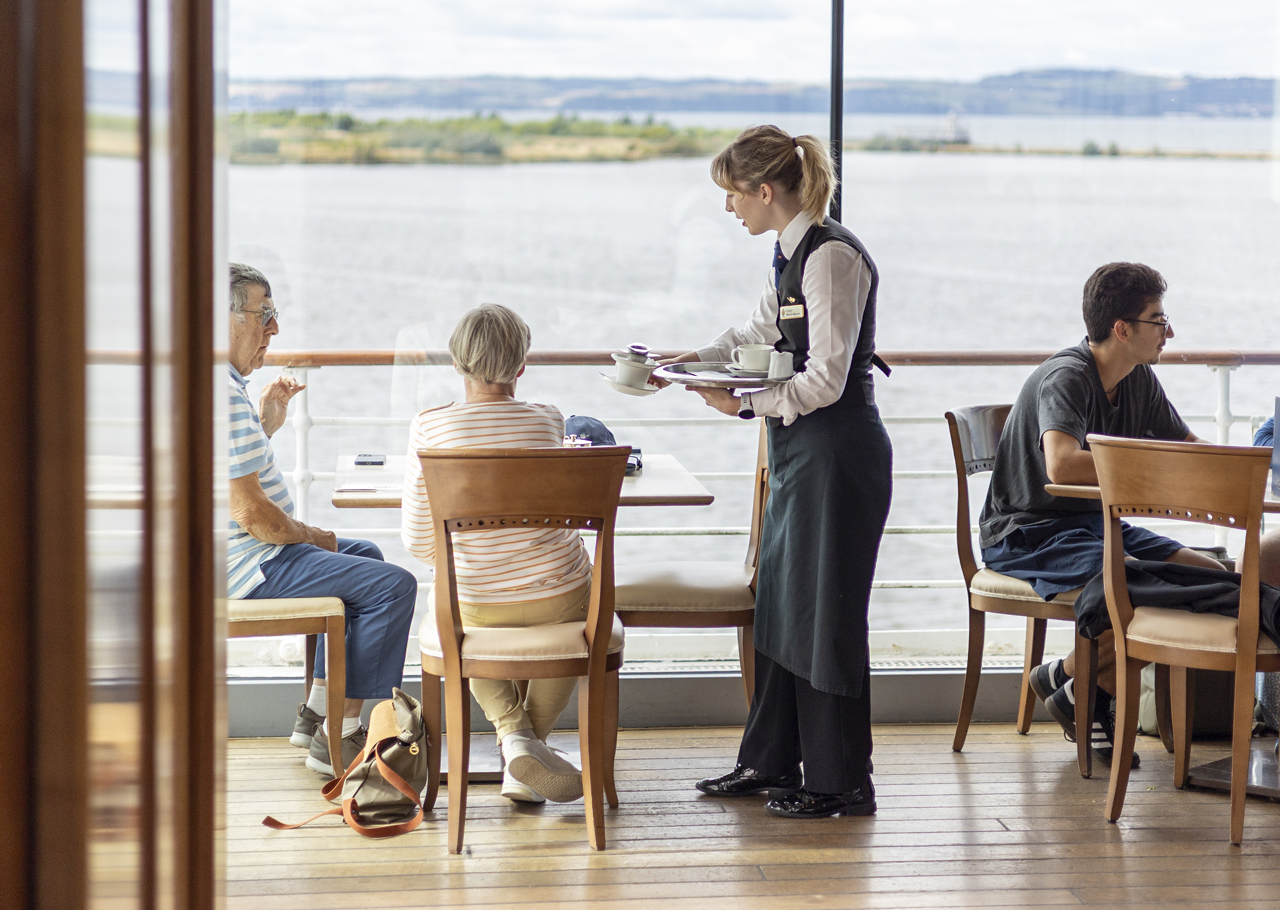 Hospitality Server, Verity, serving cups of tea to guests as they take in the stunning waterfront views from the Royal Deck Tearoom.