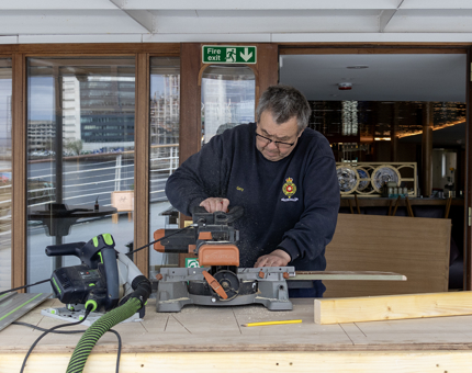 Senior Facilities Officer, Ricky, adding finishing touches to the Visitor Assistant's sentry box on the quayside.
