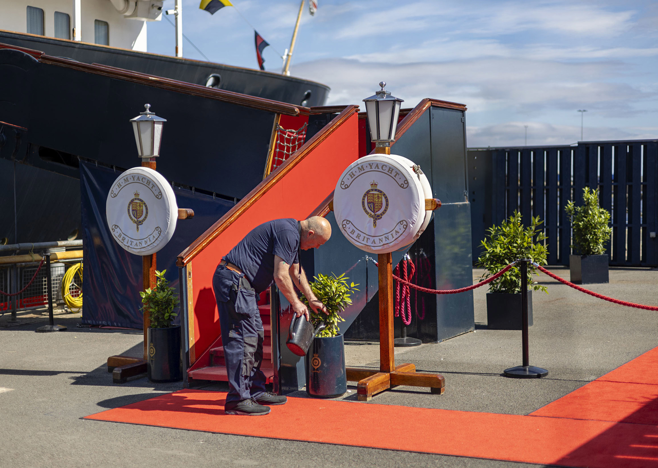 Facilities Officer, Mark, watering plants next to the Royal Brow, the special gangway that was used by the Royal Family and their guests to board Britannia.