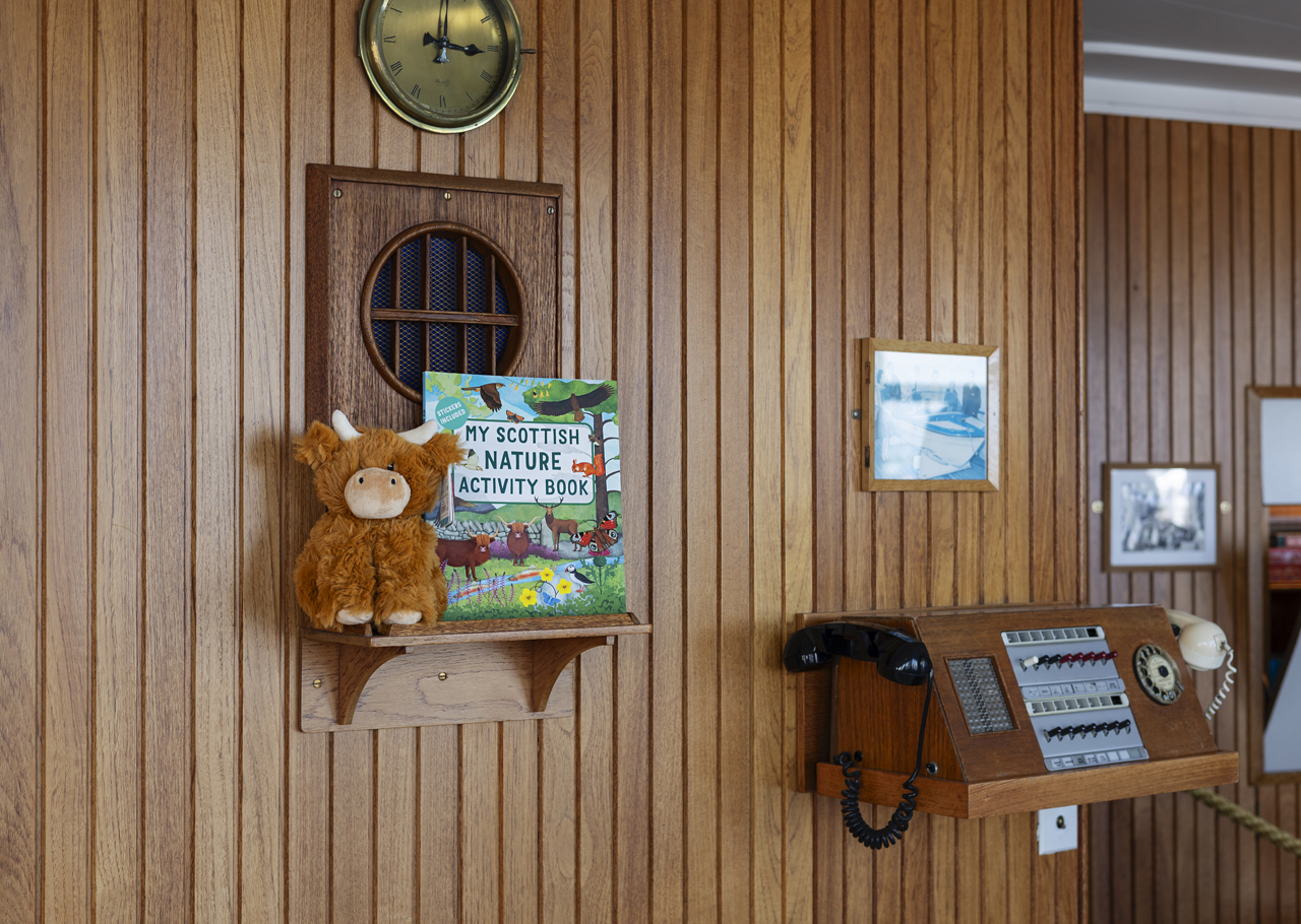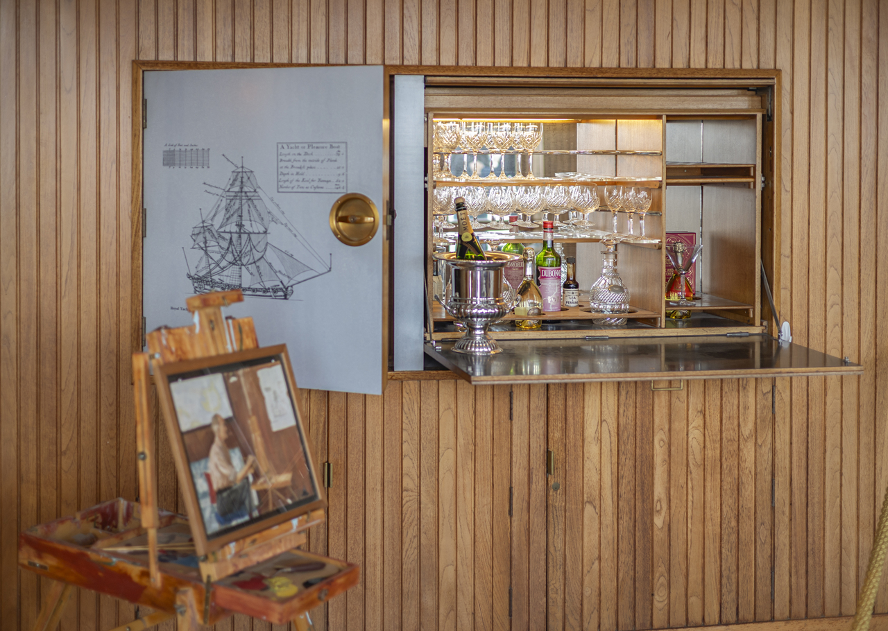 The Sun Lounge, a gorgeous teak-lined room, was one of Queen Elizabeth II's favourite spaces aboard Britannia. Behind the illustrated wall panels of former royal yachts lies a cleverly hidden drinks cabinet.