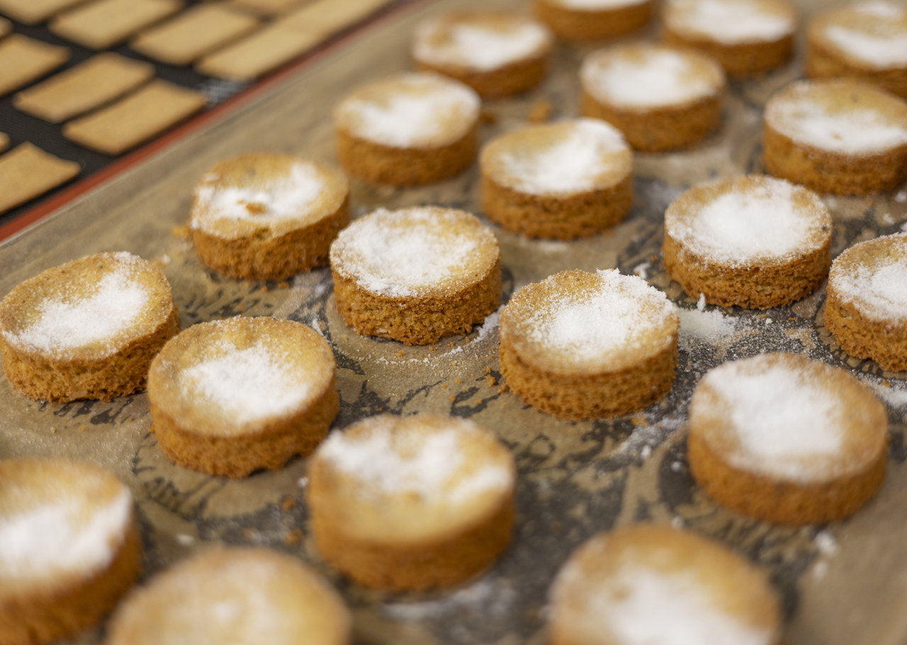 In the onboard Galley, the crew prepares a delicious sweet treat, Douglas fir sablé to be topped with pastry cream and Scottish raspberries, served on the five-course Afternoon Tea.