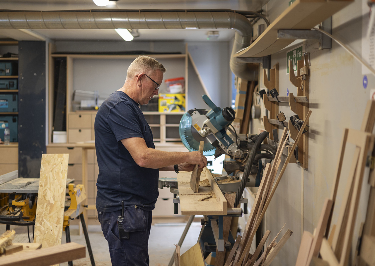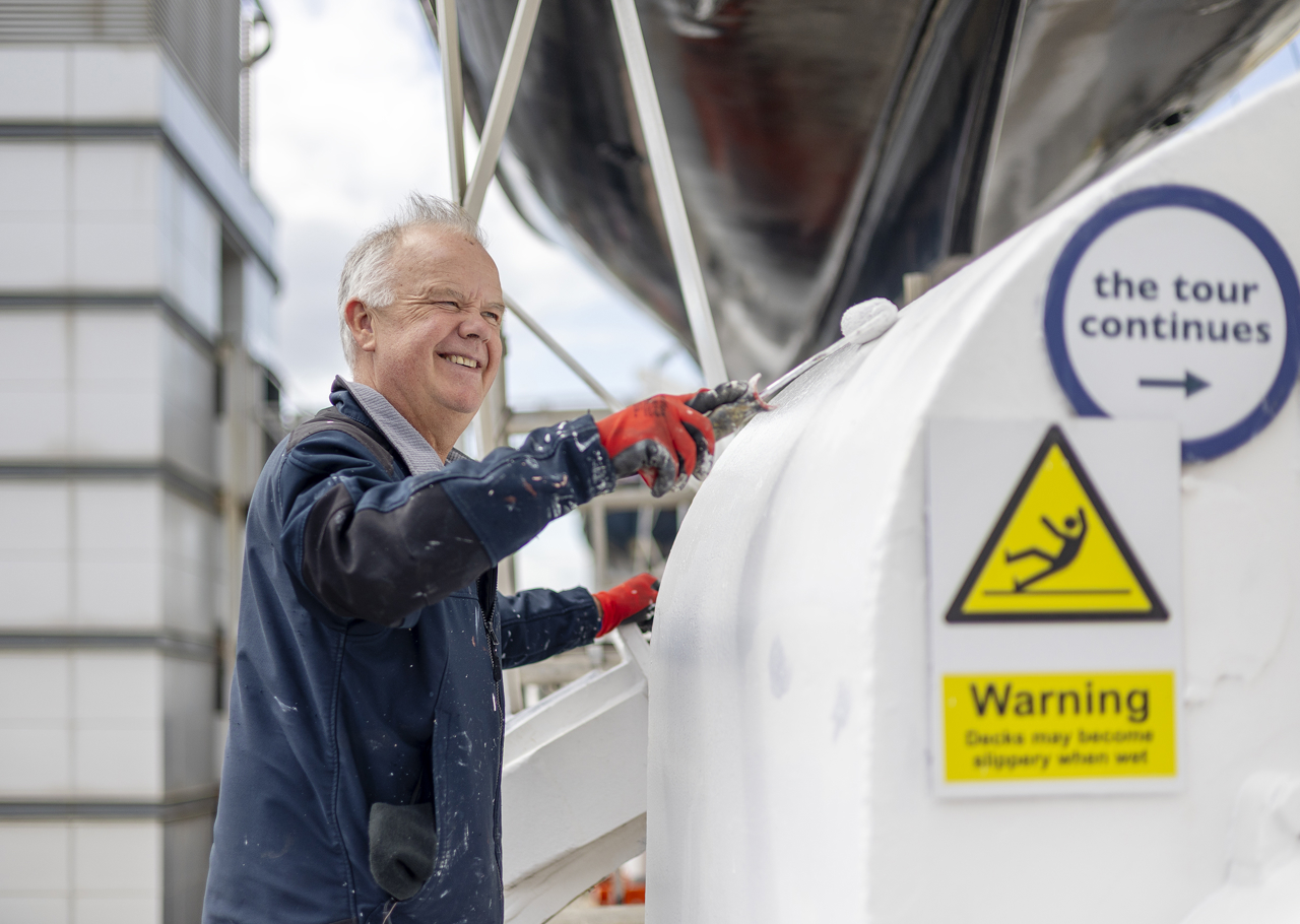 Lynne, Housekeeper, polishing a display case in the Visitor Centre, which holds a 1/72 scale model of Britannia, built by Ray Scrivens.