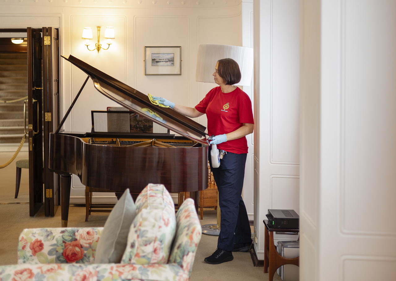 Housekeeper, Renata, dusting the Welmar baby grand piano in the Drawing Room. Princess Diana, Princess Margaret and Princess Alexandra were all known to enjoy playing the baby grand on board Britannia.