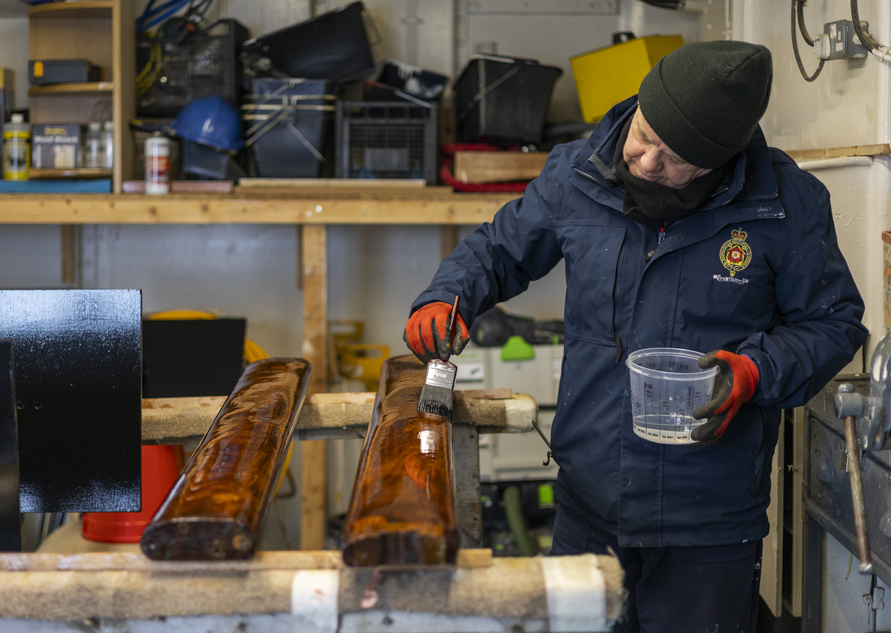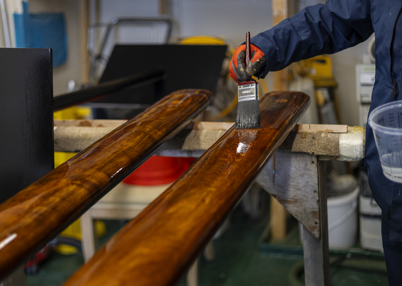 Housekeeper, Elise, maintaining the shine on the ship’s extensive brass handrails, it is a significant task.