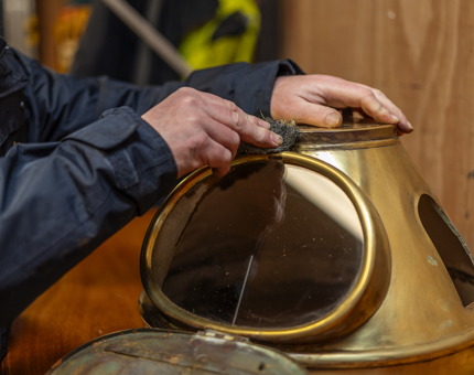 Facilities Officer Billy carefully cleaning the Binnacle, ensuring this remains shipshape for visitors.