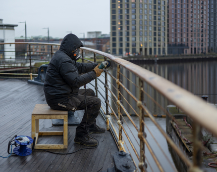 Taking great care, Rab strips paint from handrails, preparing the surface for a flawless restoration.