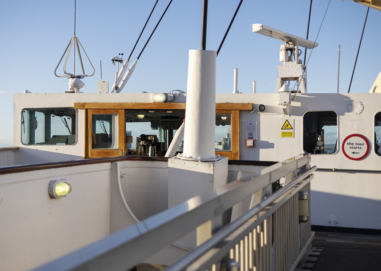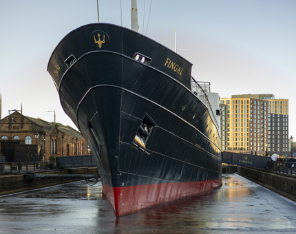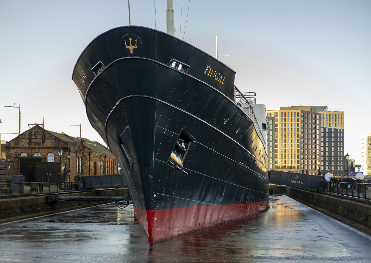 The impressive prow of Fingal, once a Northern Lighthouse Board tender, cutting a dramatic figure at the water’s edge.