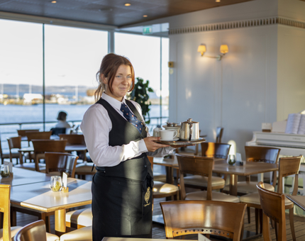 Niamh, Hospitality Server, carrying a tray of tea to visitors in the Royal Deck Tearoom, providing a peaceful pause with a view.