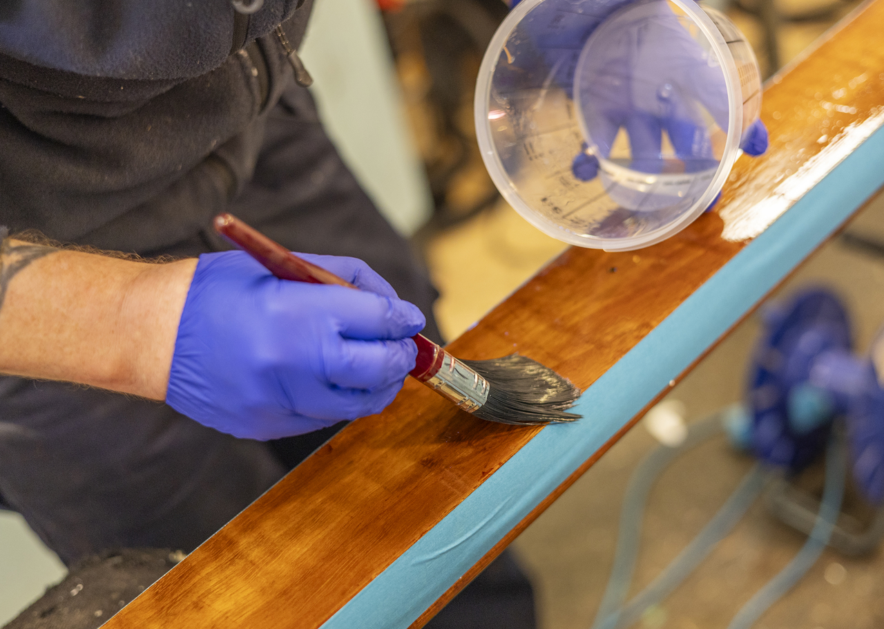 Jay constructing an enclosed space within the Fingal Hotel Workshop, designated for varnishing and painting tasks.