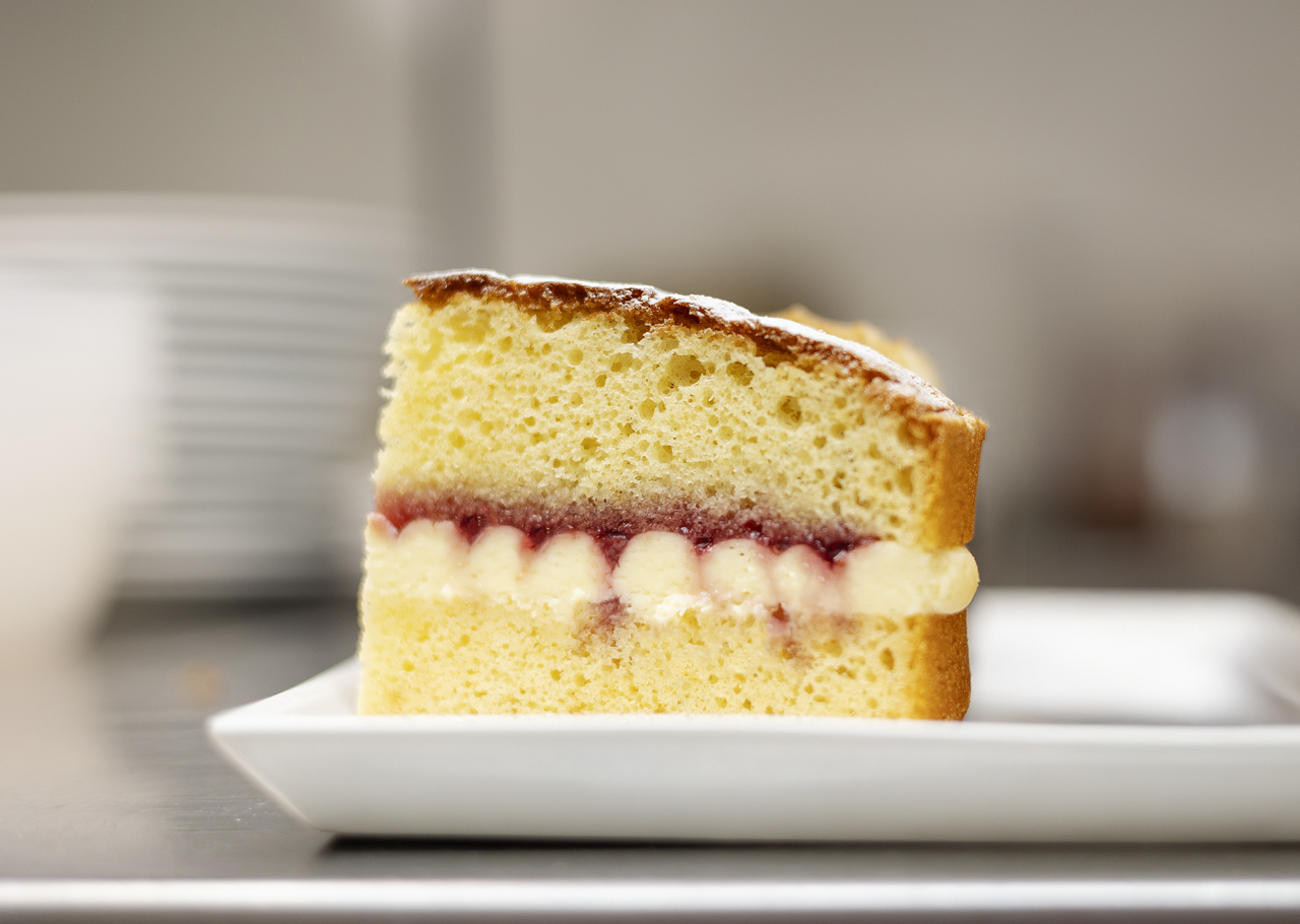 Treat yourself to a luxurious slice of Victoria sponge, layered with berry jam and white chocolate cream.