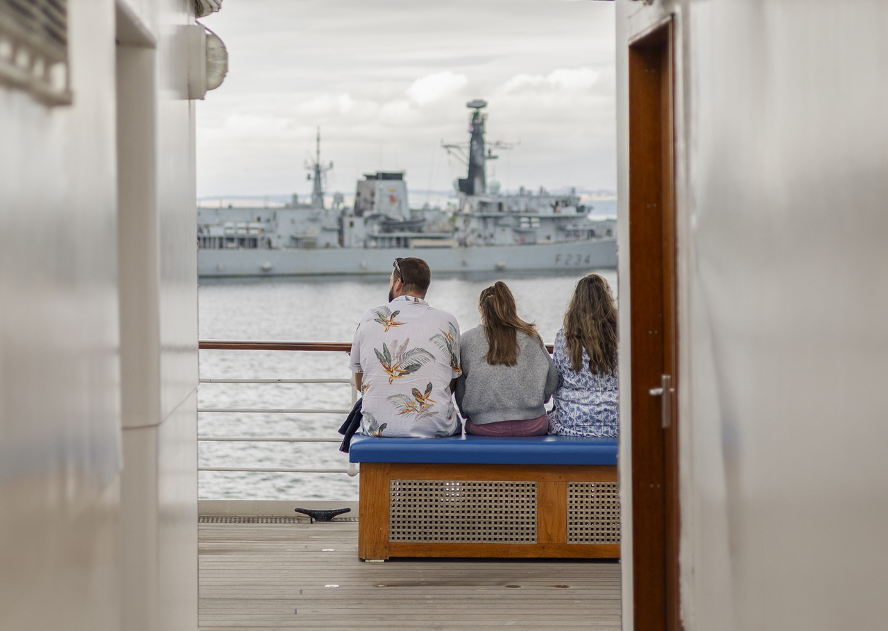 Visitors take a moment to pause touring the five decks to watch HMS IRON DUKE a Type 23 Frigate ship, leaving the Port of Leith.