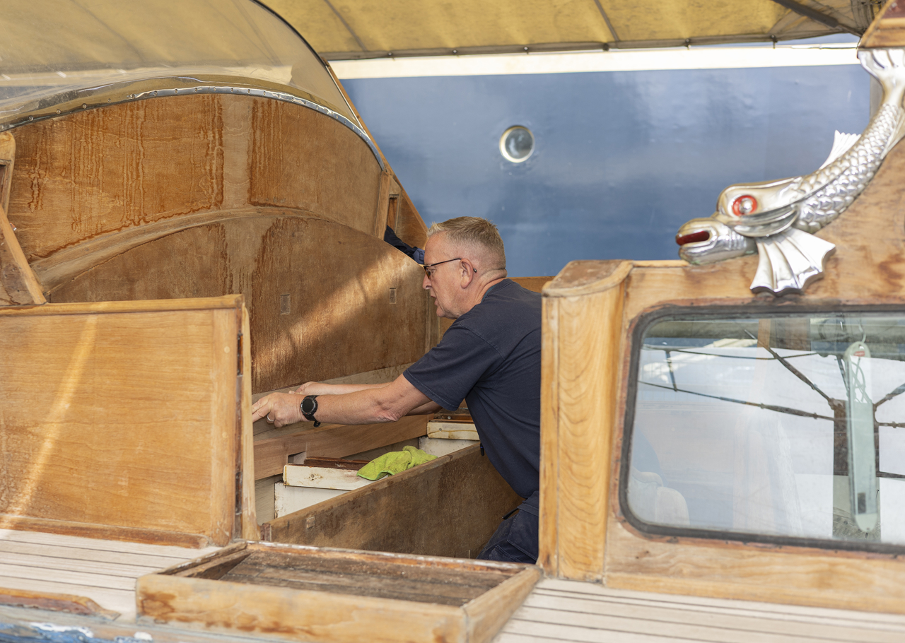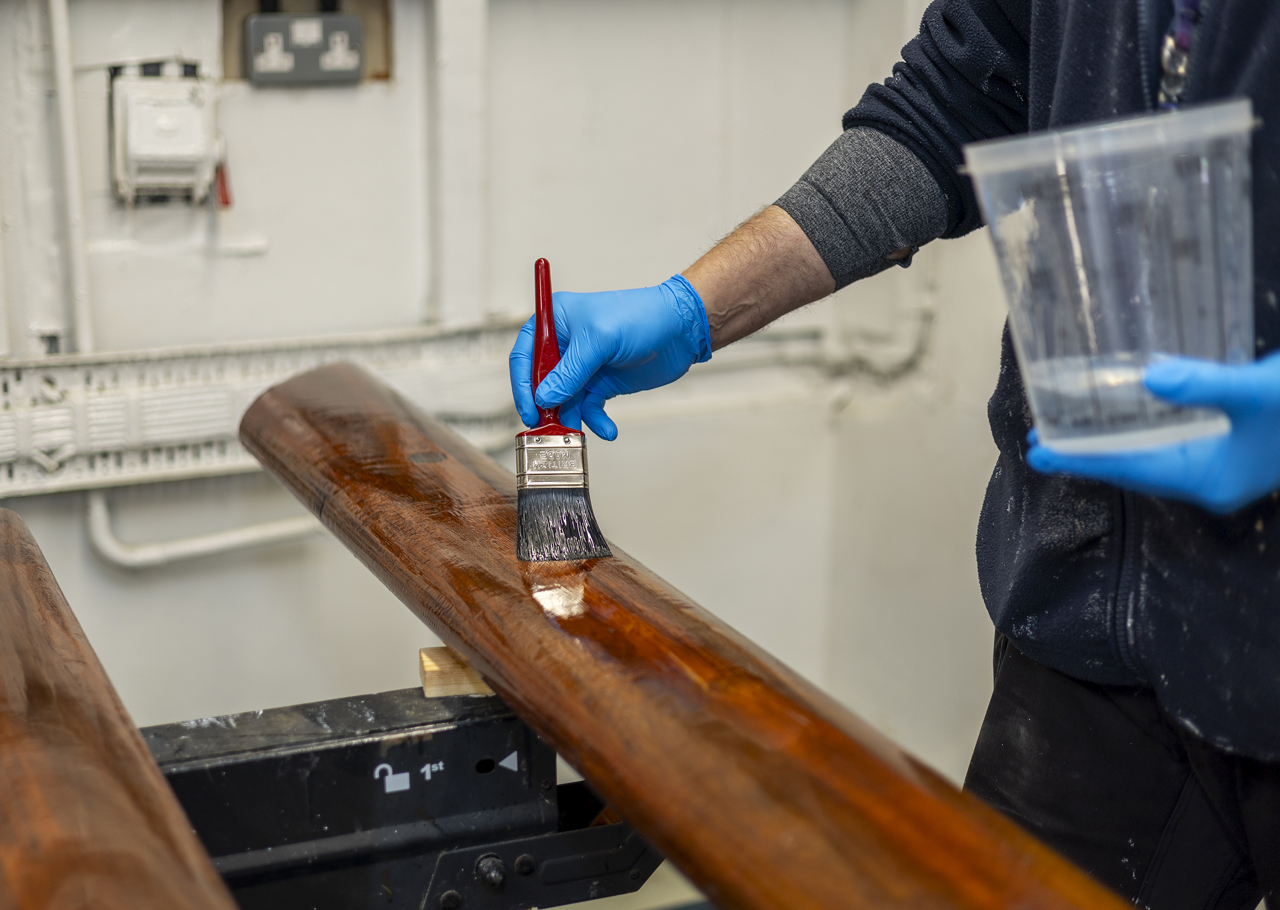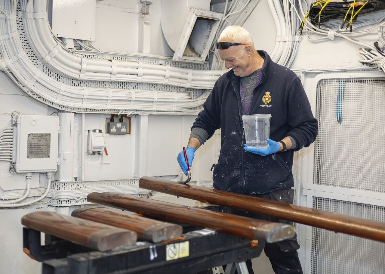 Housekeeper, Lynne carefully dusting the Sun Lounge, one of Queen Elizabeth II’s favourite spots aboard the Yacht.