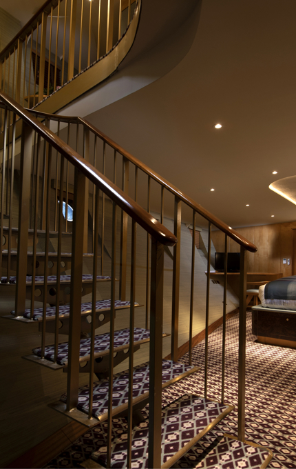 Ornsay, a luxury duplex cabin set over two floors, united by a spiral staircase.