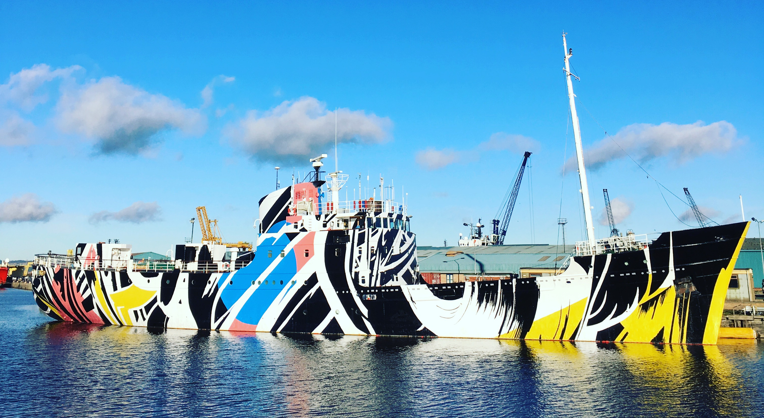 During this time, Fingal was ‘dazzled’ as part of the WW1 commemorations, painted like the Royal Navy and Merchant Navy ships had been to confuse the enemy submariners during the First World War. A stunning design was commissioned by Turner Prize Finalist, Ciara Phillips.
