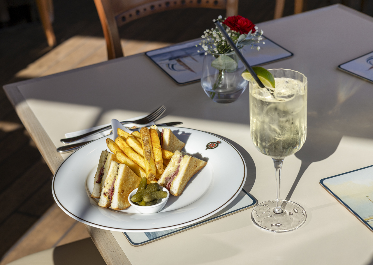 New to the menu in the Royal Deck Tearoom, Britannia’s Reuben sandwich is layered with pastrami, mature cheddar, sauerkraut and Dijon mustard, and served with fries and pickles.