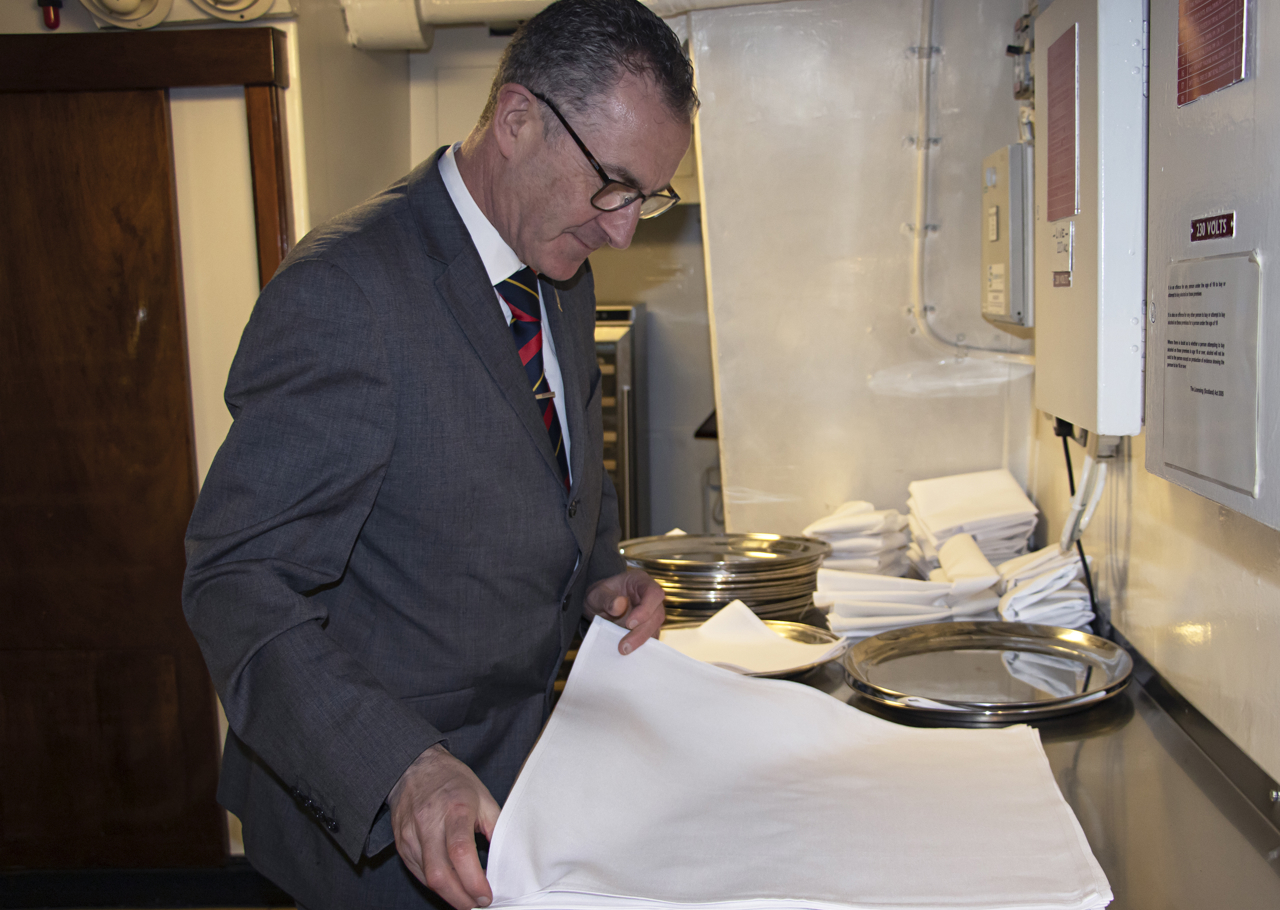 Acting Hospitality Food and Beverage Manager, Bruce, folding the perfect napkin in preparation for an exclusive event on board Britannia.