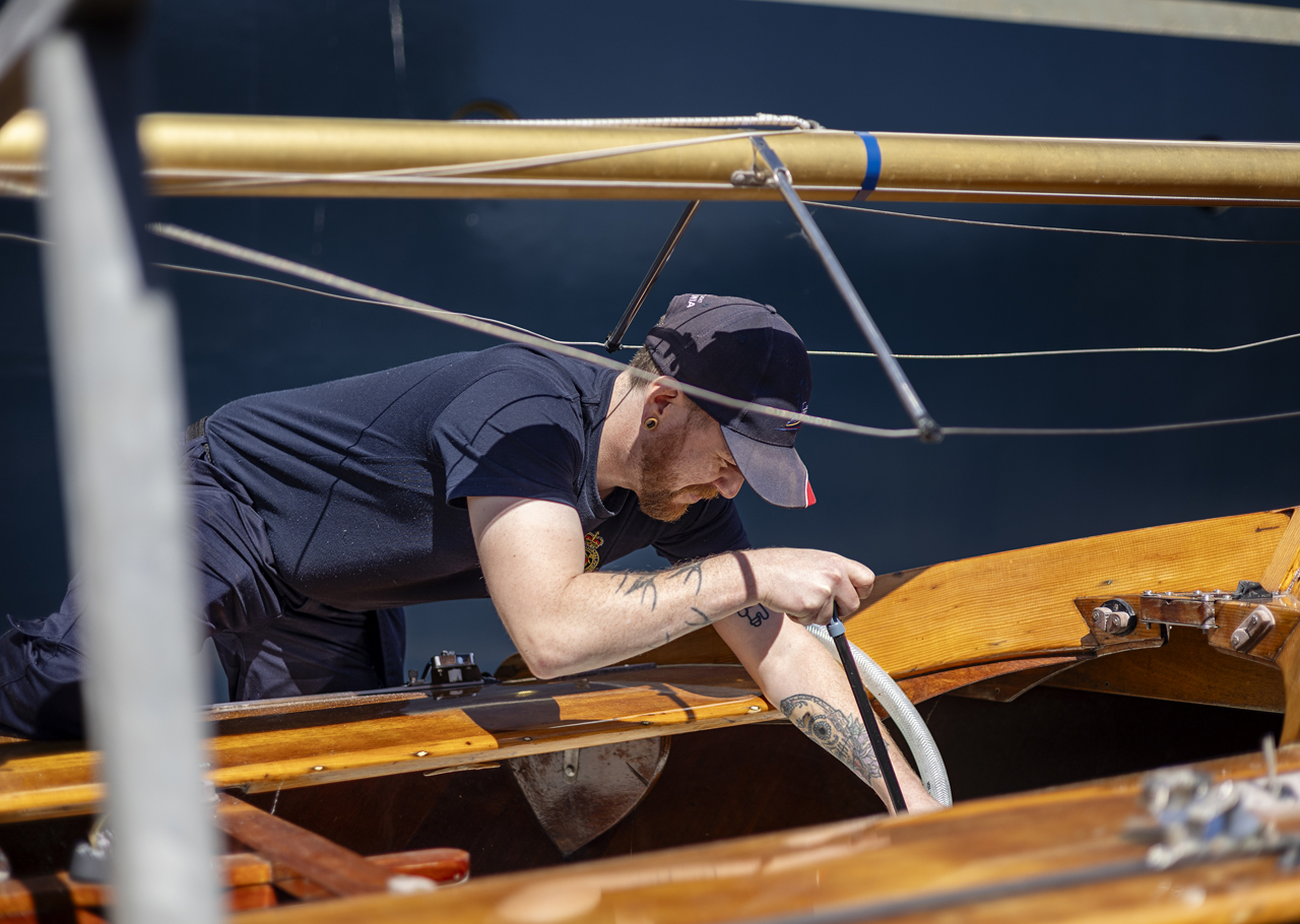 Sean pumping rain water from Coweslip, a 20-foot Flying Fifteen keelboat, located on Britannia's quayside.