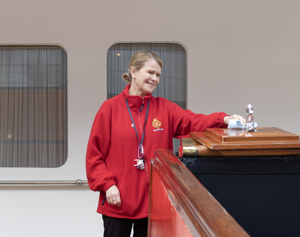 Senior Host, Gayle, and Waiter, Achilleas are delighted to be greeting visitors to the Royal Deck Tearoom.