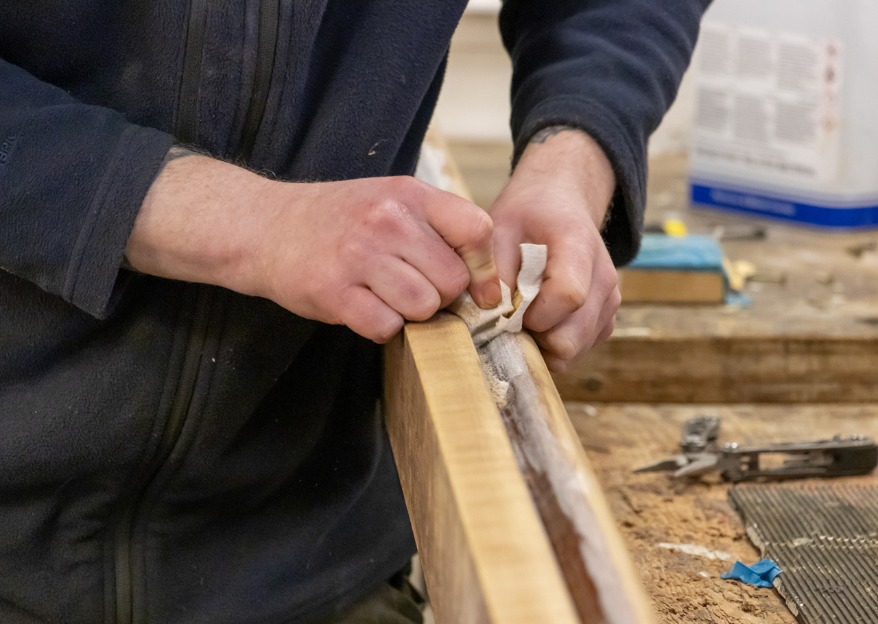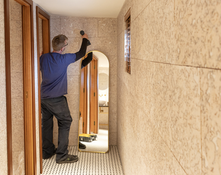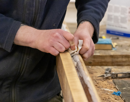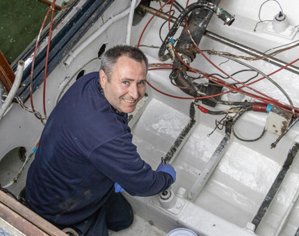 Senior Facilities Officer, Ricky, adding finishing touches to the Visitor Assistant's sentry box on the quayside.