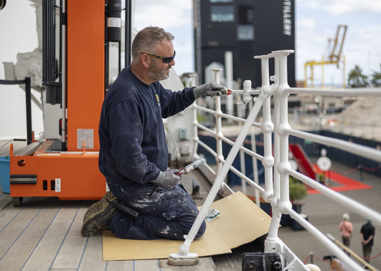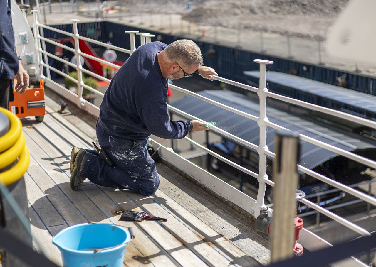 Facilities Officer, Mark, watering plants next to the Royal Brow, the special gangway that was used by the Royal Family and their guests to board Britannia.