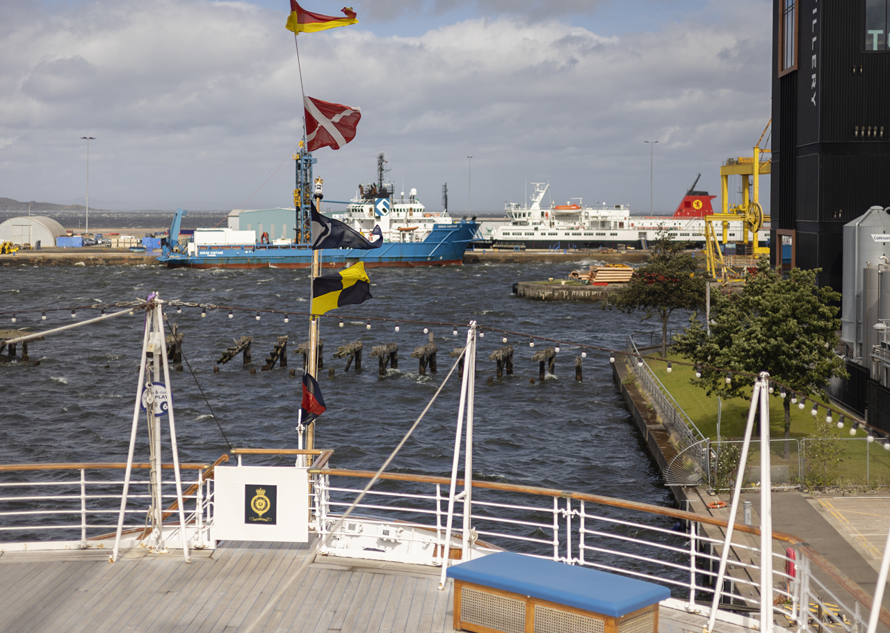 Britannia’s colourful flags flying in the breeze, set against the backdrop of the bustling Port of Leith.