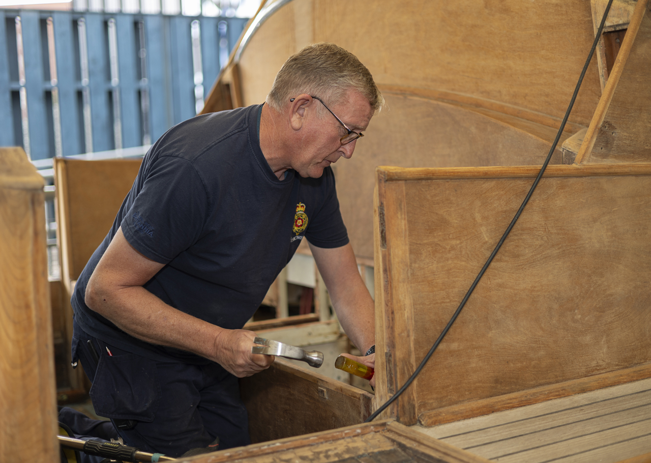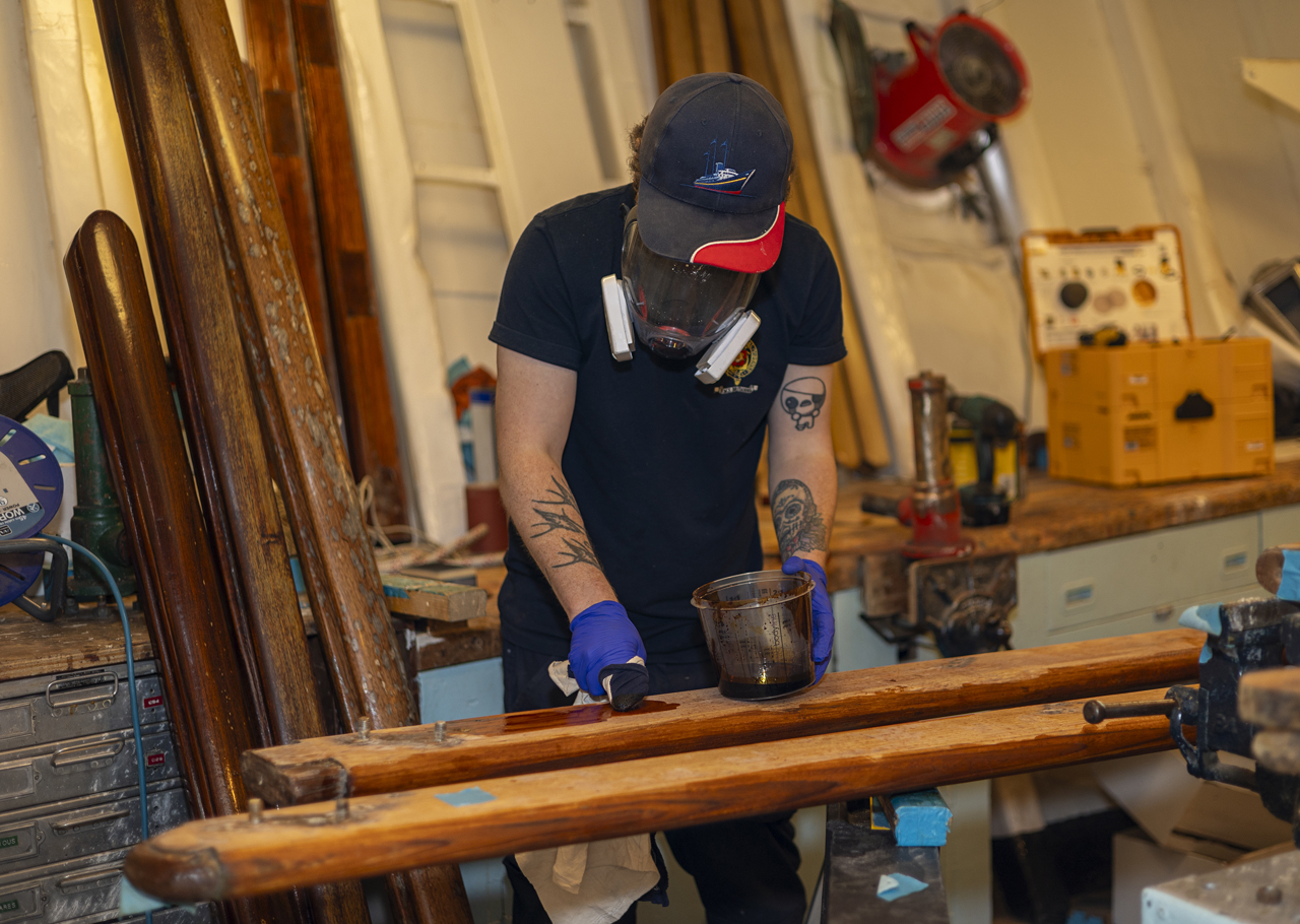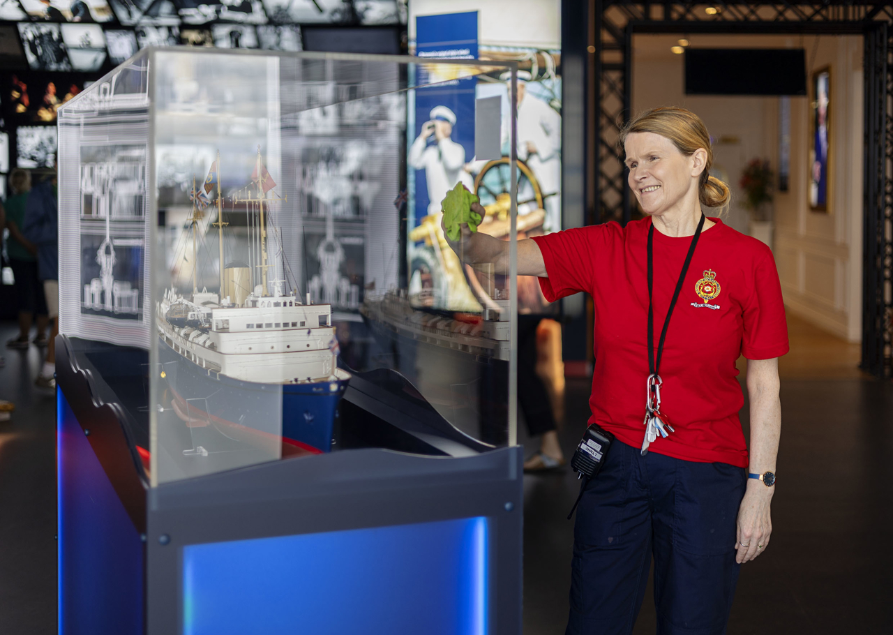 Lynne, Housekeeper, polishing a display case in the Visitor Centre, which holds a 1/72 scale model of Britannia, built by Ray Scrivens.