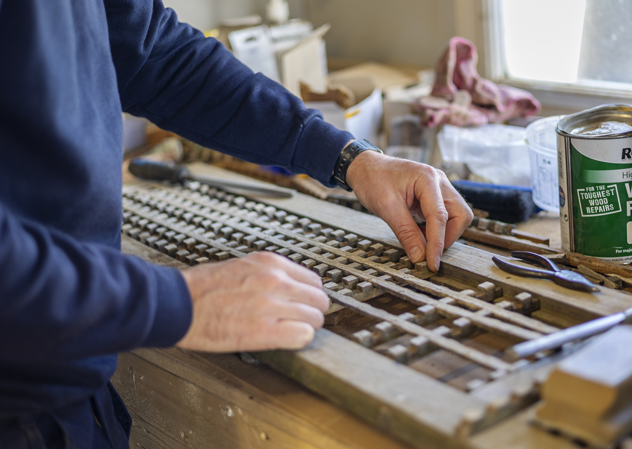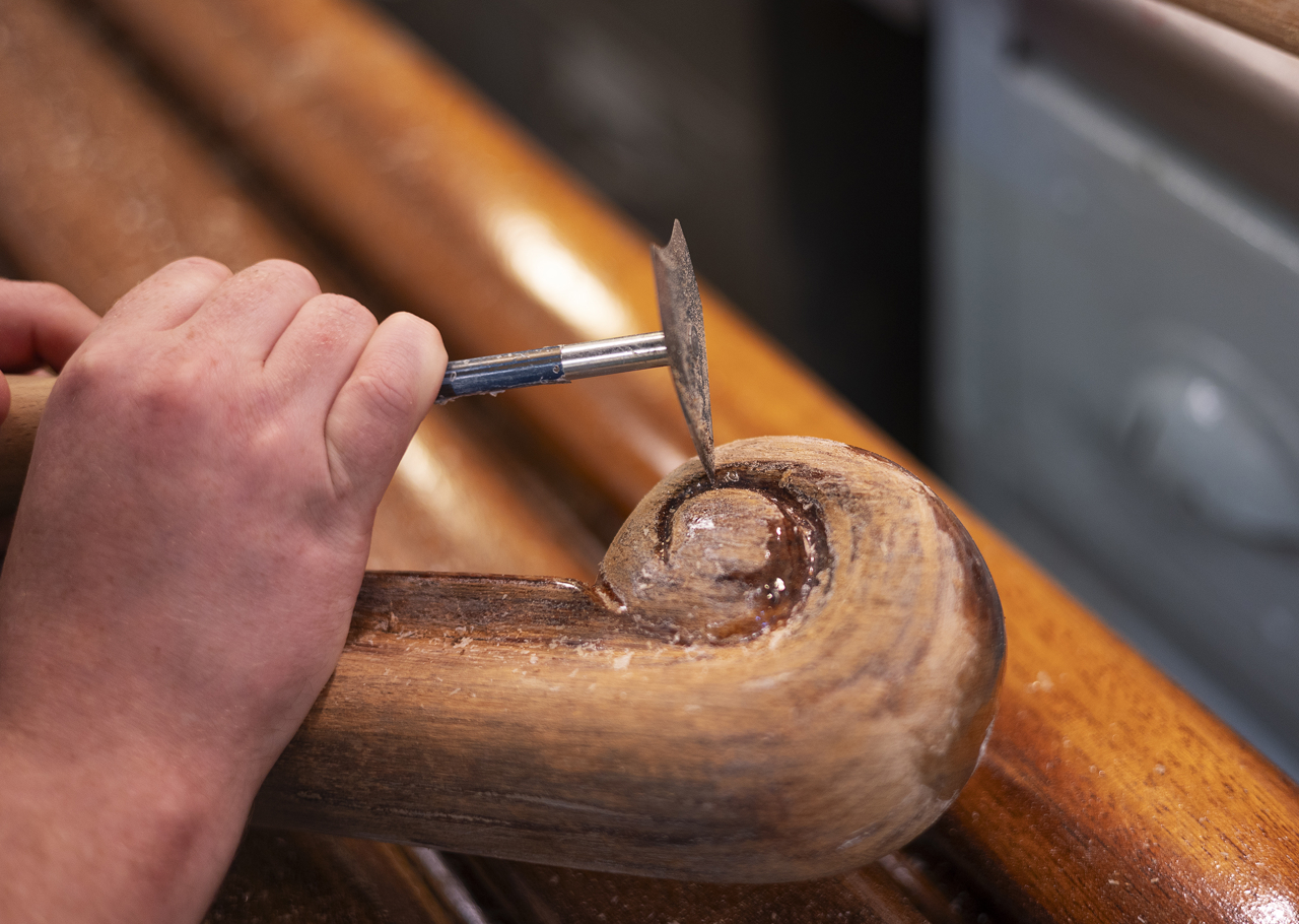 Housekeeper, Renata, dusting the Welmar baby grand piano in the Drawing Room. Princess Diana, Princess Margaret and Princess Alexandra were all known to enjoy playing the baby grand on board Britannia.