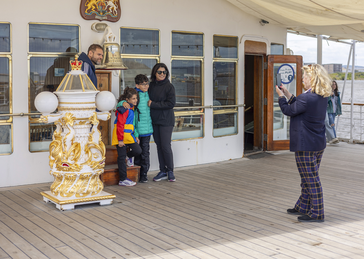 Lesley, Visitor Assistant, helping a family capture memories of their day aboard The Royal Yacht Britannia with a photo at Britannia's iconic Bell.