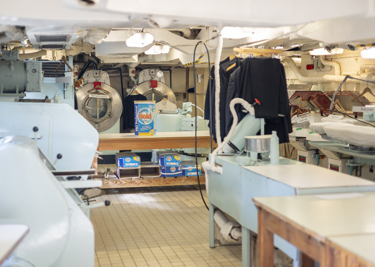 The Laundry was among the busiest areas on board. With 240 Officers and Yachtsmen potentially changing uniforms up to six times a day, the washing machines, dryers, and steam presses ran continuously to manage the enormous workload.