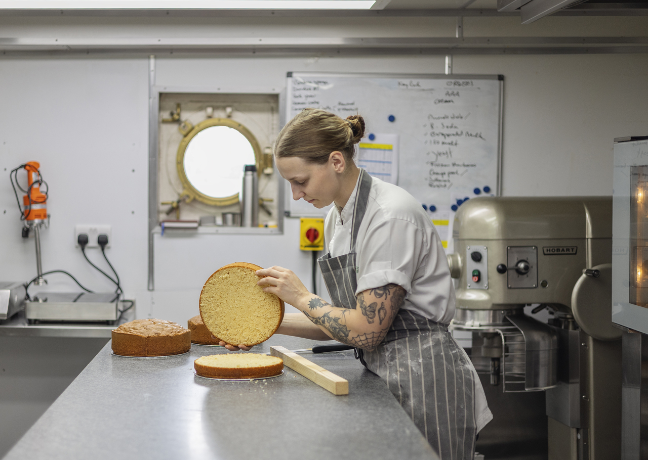 Senior Chef de Partie, Amelia, assembling Victoria sponge cakes, a favourite choice from the Tearoom menu.
