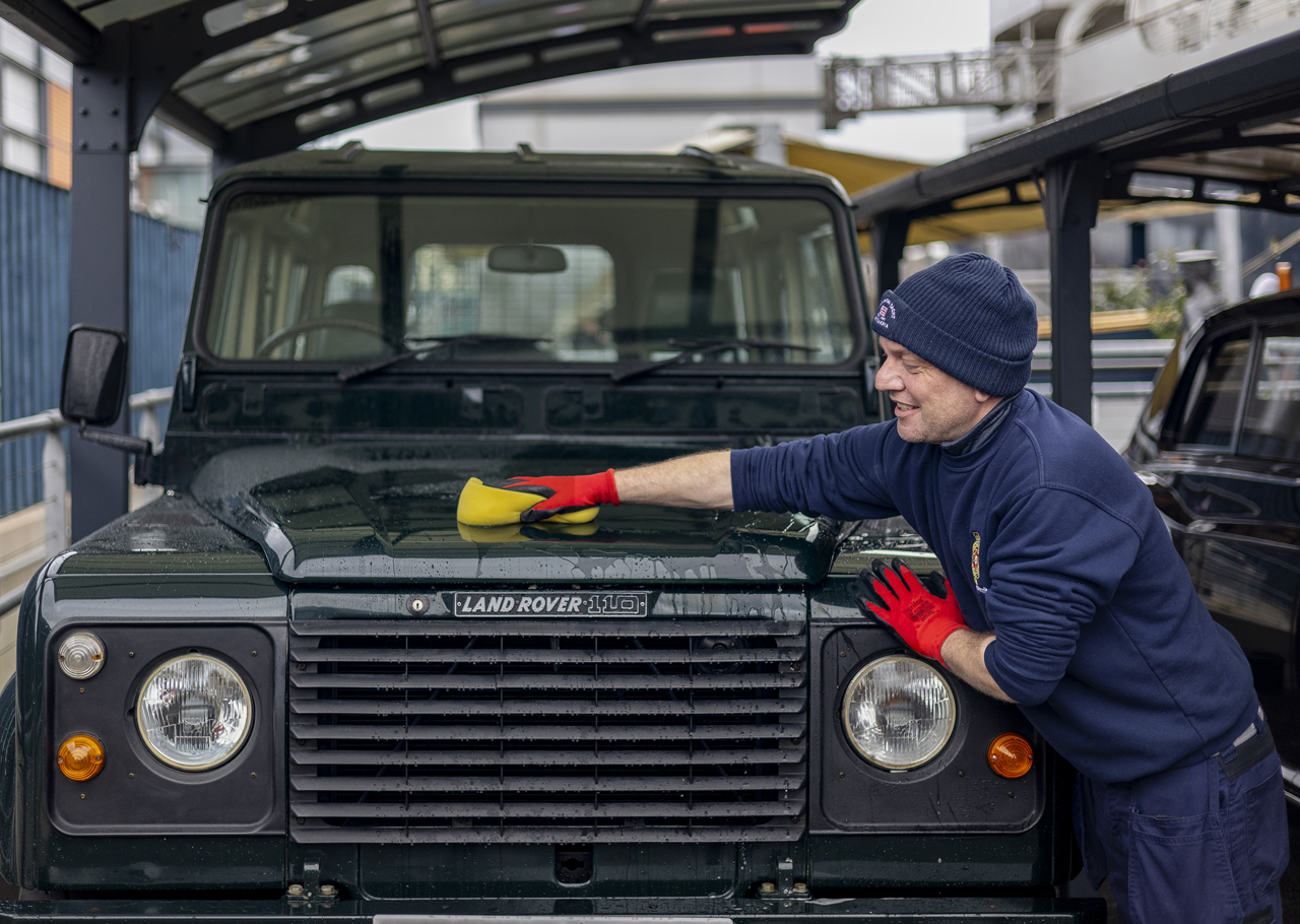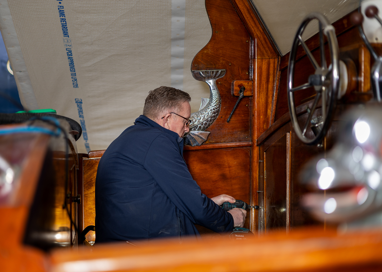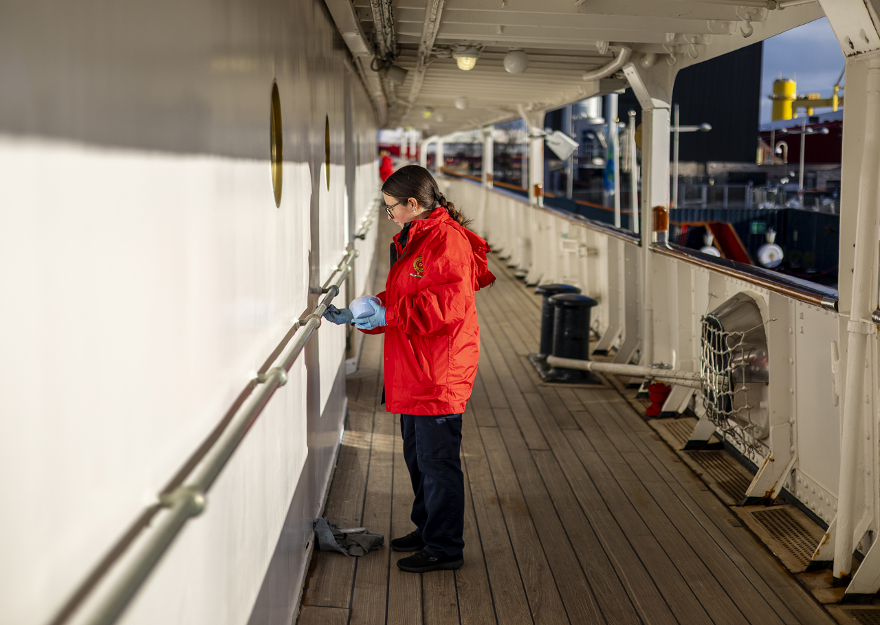 Housekeeper, Elise, maintaining the shine on the ship’s extensive brass handrails, it is a significant task.