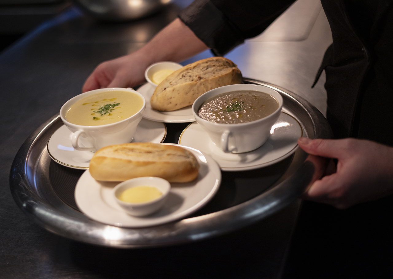 Warming bowls of soup paired with fresh bread rolls make a delicious lunch in the Royal Deck Tearoom.
