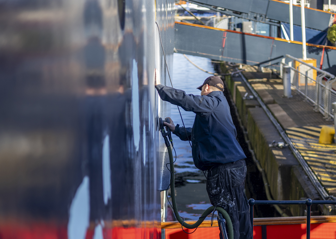 Lynne, Housekeeper, polishing a silver lamp in the Officers' Wardroom where Britannia’s nineteen Officers gathered daily to share meals and relax after long periods on duty.