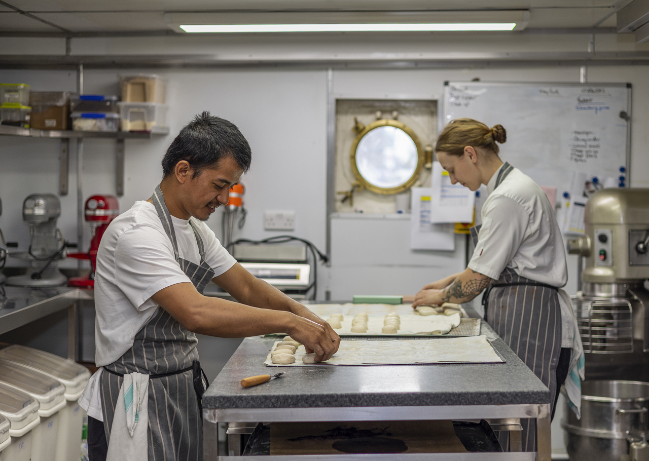 Hemant, Kitchen Porter, and Amelia, Senior Chef de Partie, preparing bread rolls for an evening event.