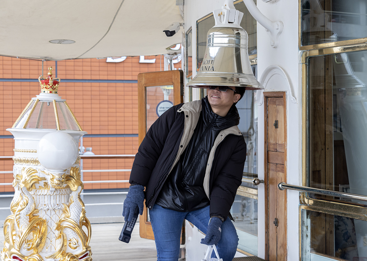 Fun aboard The Royal Yacht Britannia, with a visitor posing for a playful photo under Britannia's bell.
