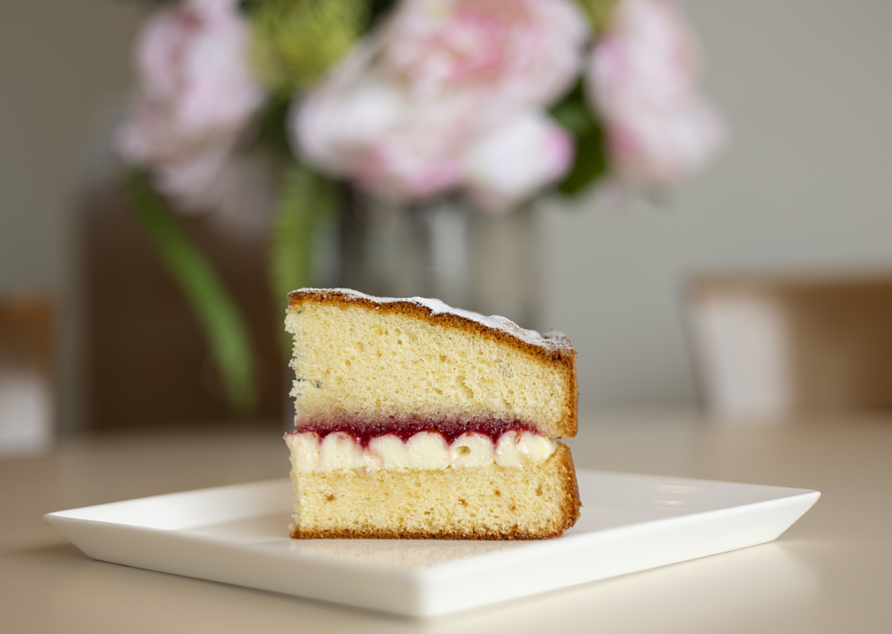 Decadent slices of Victoria sponge cake with berry jam & white chocolate cream await visitors in the Tearoom.