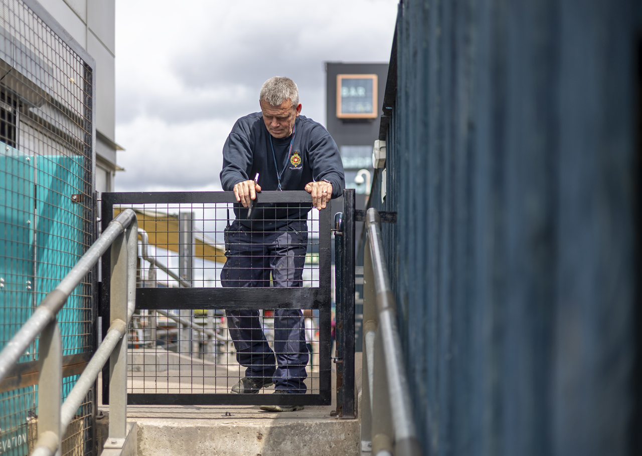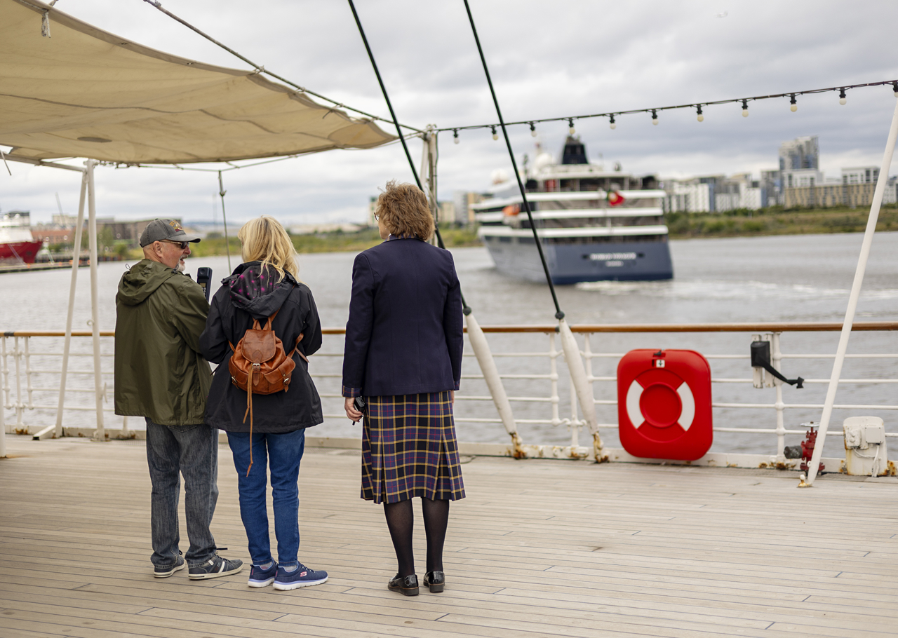 Catriona, Visitor Assistant, chatting with visitors on the Verandah Deck as they watch a cruise ship come into the port.