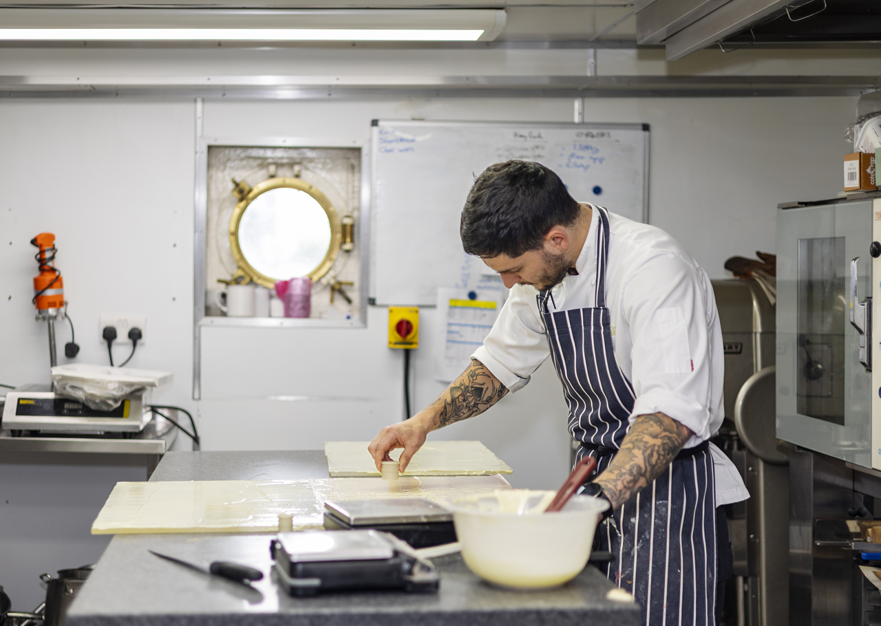 Bob, Junior Sous Chef, making chocolate decorations for desserts being served at an exclusive evening event.