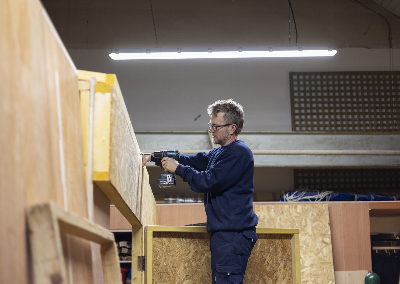 Jay constructing an enclosed space within the Fingal Hotel Workshop, designated for varnishing and painting tasks.