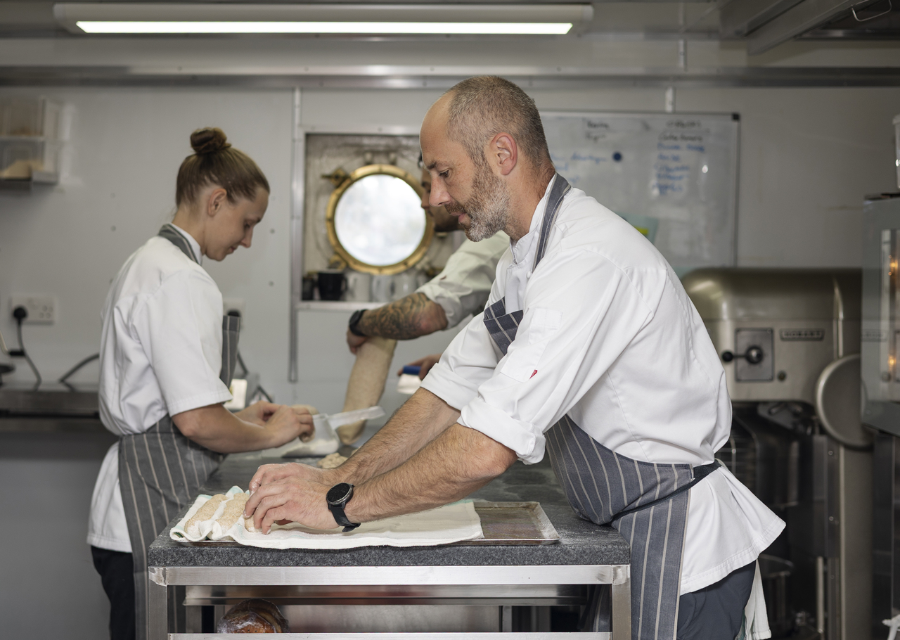 In the onboard Galley, Executive Pastry Chef Stephen, Senior Chef de Partie, Amelia, and Junior Sous Chef, Bob, are preparing rolls to be served at an evening event.