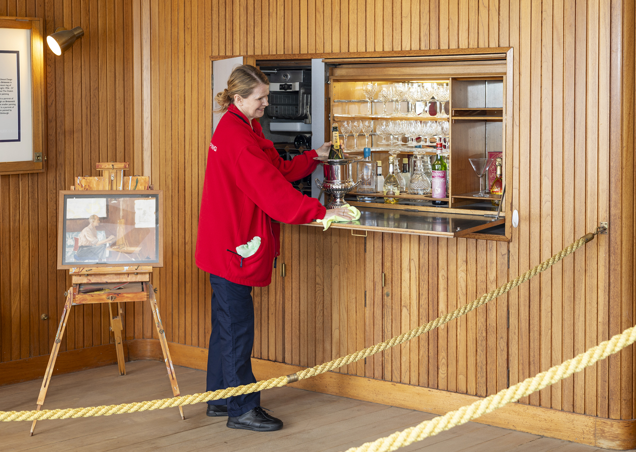 Housekeeper, Lynne carefully dusting the Sun Lounge, one of Queen Elizabeth II’s favourite spots aboard the Yacht.